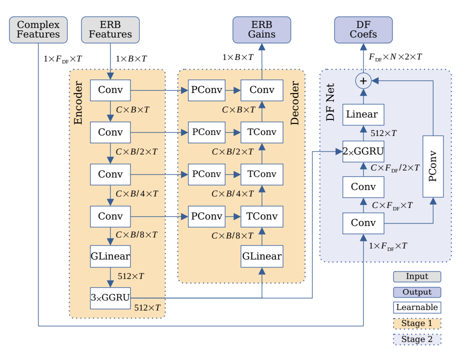 给定带噪语音信号x(t),经过STFT后的频域信号为X(k,f)。此框架可以支持最高48kHz的采样率,STFT的窗长N_FFT为5ms到30ms之间。默认情况下,我们使用的50%的overlap,但是也支持更高的overlap。我们为深度神经网络使用两种类型的输入特征。对于ERB编码器和解码器特征X_{ERB}(k,b),b ∈ [0,N_{ERB},我们计算对数功率谱图,用使用衰减时间为 1 秒的指数均值归一化方法对其进行归一化处理,并应用一个可配置频段数量N_{ERB}的ERB滤波器组。